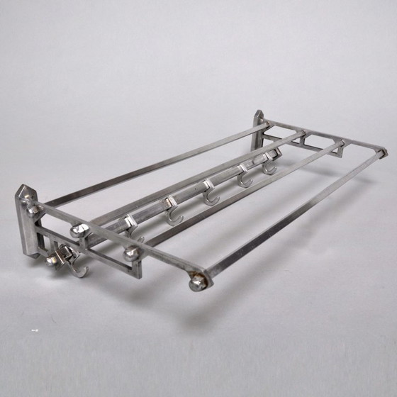 Perchero de pared de estilo art decó de los años 50, fabricado en hierro y aluminio y equipado con 6 ganchos deslizantes sobre tubo cuadrado, piezas laterales en tubo plano y un perchero compuesto por 4 varillas.