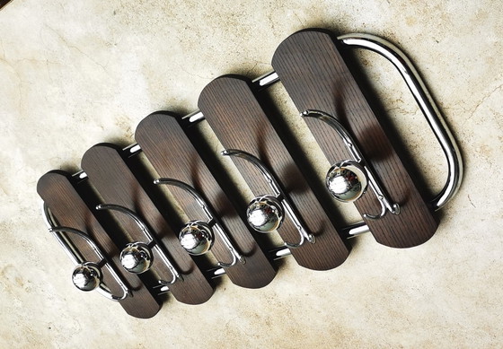 Este perchero de pared se encuentra en excelentes condiciones. Diseño danés en cromo y madera. Se cuelga por ambos lados mediante dos orificios ranurados.