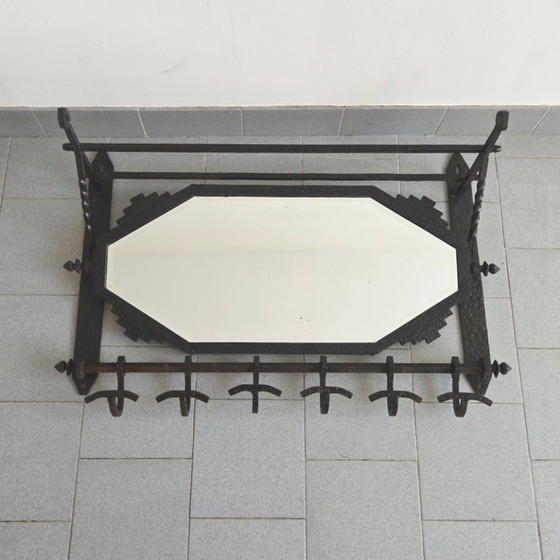 Perchero de pared con espejo, estilo art déco francés, años 20-30, metal martillado.