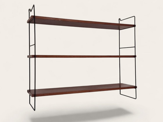 Precioso perchero de pared Mid Century vintage de la década de 1960. El perchero tiene un aspecto escandinavo natural gracias a su diseño elegante y al uso de chapa de teca de alta calidad. Los marcos de metal negro le dan un acento resistente.