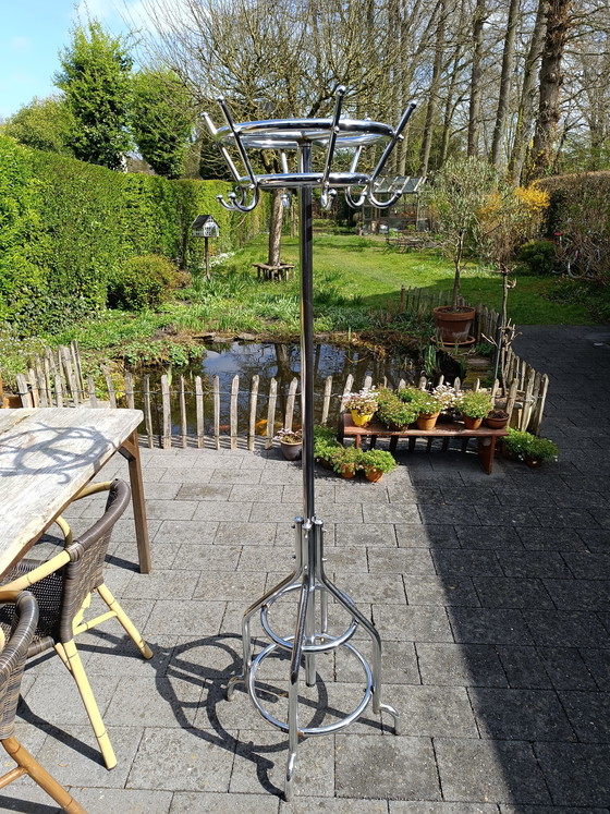 Perchero Tubax de metal cromado estilo Art Déco de los años 30, fabricado en los años 60. Cuenta con una base estable de 4 patas montadas sobre un anillo y 6 ganchos en un cabezal redondo giratorio. Incluye todas las tuercas originales y las tapas de goma en la parte inferior de las patas. Presenta leves signos de uso y pequeñas manchas de óxido.