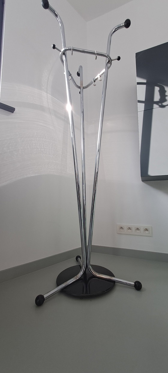 Perchero de pie Tubax vintage de los años 50-60, fabricado en acero y cromado negro. En excelente estado. Con 6 ganchos, 2 x 3 extremos de bola negros acampanados y un peso flotante de hierro macizo en la base. Altura: 174 cm, Ancho: 60 cm, Peso: 14 kg.