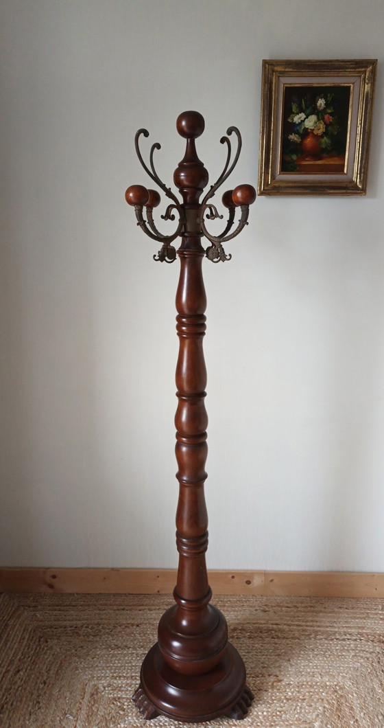 Perchero antiguo del siglo XX con patas, fabricado en madera de haya torneada, latón y metal dorado patinado por el tiempo. Base con tres garras de león. Lleno de encanto y autenticidad. En buen estado general.