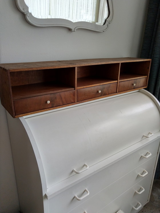 Antiguo escritorio o mueble con tres compartimentos abiertos y tres cajones. Longitud 98 cm, profundidad 21 cm, altura 21 cm. Totalmente de roble macizo. Los frentes de los cajones están chapados (caoba ?) con pomos de mano blancos (porcelana ?). Anchura 31 cm, altura 7 cm, profundidad 19,5 cm.