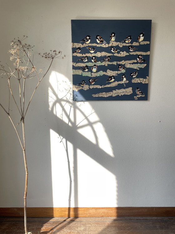 Hermoso retrato de un grupo de carboneros currucas, "Vida en concierto", posados sobre ramas/líneas de partitura. El color de fondo es azul. Se han incorporado partituras antiguas a la pintura. Esta pintura fue realizada recientemente en 2022. Es la continuación de una serie de retratos de aves holandesas, realizados durante la pandemia. Esto me inspiró a observar la naturaleza con lupa. ¡Ampliando la imagen! Pintado por Britt Kleiberg en 1980, Amersfoort Studio, ubicado en Harderwijk. Britt pinta animales de todo el mundo con una historia. Durante la pandemia, ha dado un protagonismo especial a las aves holandesas. Se graduó en Diseño Gráfico y Estilismo antes de descubrir su vocación en el arte contemporáneo. Nacida en una familia con un profundo interés por el arte, entró en contacto con él a temprana edad y comenzó a pintar a los 10 años. Le encantaba ir a museos y agradece la educación temprana que recibió, que le ha proporcionado la base para su trayectoria actual como artista contemporánea. Positividad, colores y libertad de movimiento El uso del color es una parte importante de su vocabulario artístico: "Los colores hacen felices a las personas y quiero traer alegría y positividad al mundo. Su paleta de colores puede representar el entorno natural de un animal, una cacería o una emoción; dependiendo de lo que quiera comunicar. Y por más sutil que sea, el fondo también forma parte de esto. Utiliza pequeñas y extrañas formas de color para 'rellenar' a sus animales. Estas representan continentes imaginarios", explica, "y pueden representar las áreas a las que pertenece el animal o donde quiere estar. En mi mundo artístico, todo es posible.