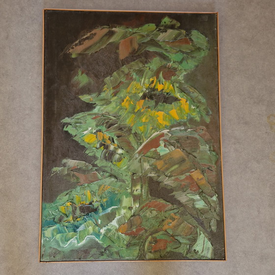 Esta es una hermosa pintura al óleo sobre lino de mediados de siglo, con un vibrante motivo de girasoles de las décadas de 1960 y 1970. La pintura está realizada en un estilo característico del modernismo de mediados de siglo, con una rica textura y vibrantes colores en verde, amarillo y marrón. Extendida sobre un marco de madera, la obra irradia un encanto atemporal que encaja a la perfección en interiores vintage o modernos. La obra presenta signos de desgaste y el marco está en buen estado. La pintura es densa y presenta una hermosa técnica abstracta. La obra no tiene firma, o simplemente no la veo.