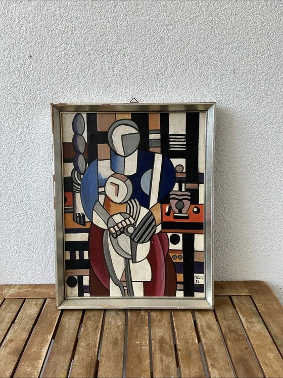 Pintura al óleo modernista de mediados de siglo firmada por F. LÉGER (1952) – Madre e hijo, estilo cubista