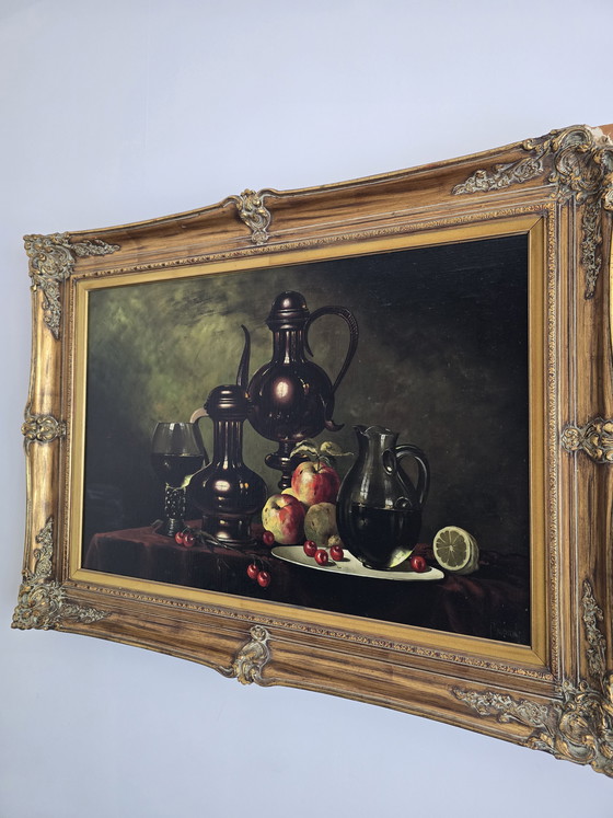 Andreas Gyula Bubarnik (1936-2010, Hungría), «Bodegón con frutas, copa de vino y jarras», siglo XX, óleo sobre lienzo, firmado en la parte inferior derecha, enmarcado en un marco dorado.