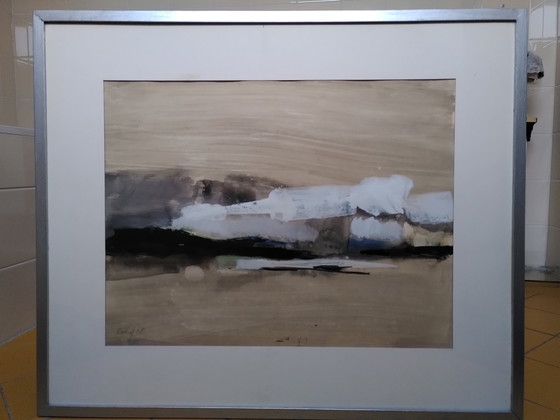 Pintura de Jos Rovers de 1968, técnica mixta. La pintura se encuentra en excelente estado. Fue ofrecida por el arquitecto que diseñó la nueva fábrica Inventum tras el incendio de finales de los años 60. Las dimensiones de la pintura (sin marco) son: 48,3 cm x 63,5 cm. La pintura conserva su marco de madera original, pintado en plata.