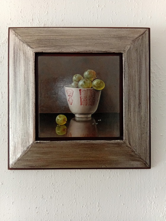 Esta hermosa pintura de Sven van Dorst, titulada «Gota de Rocío», es un refinado ejemplo de arte realista. Creada en 2010, esta obra captura la delicada belleza de una naturaleza muerta con uvas y una taza de cerámica. Las sutiles transiciones de color y la atención al detalle la convierten en una pieza impactante para cualquier colección de arte.