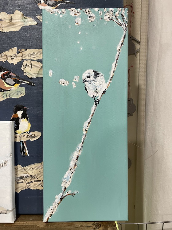 Título: 'romper el silencio' Bonito retrato de un herrerillo capiblanco sobre una rama de partituras. Están nevando notas musicales y el perejil está soltando sus semillas, en los copos de nieve que se arremolinan con el viento. Este cuadro se pintó hace poco, en 2025. Este retrato pertenece a la serie Pájaros holandeses; 'pájaros de invierno' Pintado por Britt Kleiberg 1980, Amersfoort Atelier con sede en Harderwijk Britt pinta animales de todo el mundo con una historia. Durante el periodo de la corona, destacó los pájaros holandeses. - Realizó un curso de diseño gráfico y estilismo antes de encontrar su vocación en el arte contemporáneo. Nacida en una familia con un sano interés por el arte, estuvo expuesta al arte a una edad temprana y empezó a pintar a los 10 años. Le encantaba ir a museos y está agradecida por la educación temprana que recibió. Esto le ha proporcionado la base para su trayectoria actual como artista contemporánea. El uso del color es una parte importante de su vocabulario artístico: "Los colores hacen feliz a la gente y me gustaría aportar alegría y positividad al mundo". Su paleta puede representar el entorno natural de un animal, la caza o una emoción, según lo que quiera transmitir. Y, por tenue que sea, el fondo forma parte de ello. Utiliza formas de color curiosamente pequeñas para "rellenar" a sus animales. Representan continentes imaginarios", explica, "y pueden representar las zonas a las que pertenece el animal o donde quiere estar. En mi mundo artístico, todo es posible. Mis animales pueden vagar libremente". Más obras: www.britt-art.nl