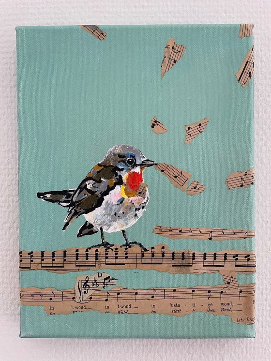 Hermoso retrato de un papamoscas rojo, en partitura. El fondo es verde y los bordes del lienzo son de un azul grisáceo antiguo. Esta pintura fue realizada recientemente en 2023. Es la continuación de una serie de retratos de aves holandesas, realizados durante la pandemia. Esto me inspiró a observar la naturaleza con lupa. ¡Ampliando lo pequeño! Pintado por Britt Kleiberg en 1980, Amersfoort Studio, ubicado en Harderwijk. Britt pinta animales de todo el mundo con una historia. Durante la pandemia, ¡ha puesto a las aves holandesas en el centro de atención! Se graduó en Diseño Gráfico y Estilismo antes de encontrar su vocación en el arte contemporáneo. Nacida en una familia con un profundo interés por el arte, tuvo contacto con él desde muy temprana edad y comenzó a pintar a los 10 años. Le encantaba ir a museos y agradece la formación temprana que recibió, que le ha proporcionado la base para su trayectoria actual como artista contemporánea. Positividad, colores y libertad de movimiento. El uso del color es una parte importante de su vocabulario artístico: «Los colores alegran a la gente y quiero traer alegría y positividad al mundo. Su paleta de colores puede representar el entorno natural de un animal, una cacería o una emoción, según lo que quiera comunicar. Y, por más sutil que sea, el fondo también forma parte de ello. Utiliza pequeñas y extrañas formas de color para «rellenar» a sus animales. Estas representan continentes imaginarios», explica, «y pueden representar las zonas a las que pertenece el animal o a las que quiere estar. En mi mundo artístico, todo es posible. Mis animales pueden vagar libremente». Más información: www.britt-art.nl