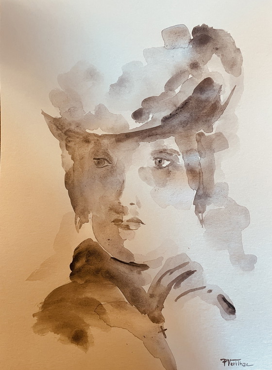 Descubra la elegancia atemporal de esta pintura del artista P. Verilhac. Esta acuarela monocromática en tonos sepia, titulada «Lumière» (Luz), captura con delicadeza y sutileza el retrato de una mujer.