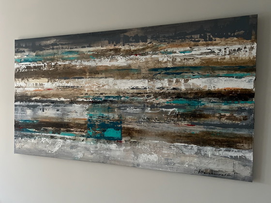 - La pintura presenta un cautivador diseño abstracto, con ricos tonos marrones, azules y blancos que se funden a la perfección para una experiencia visual dinámica.