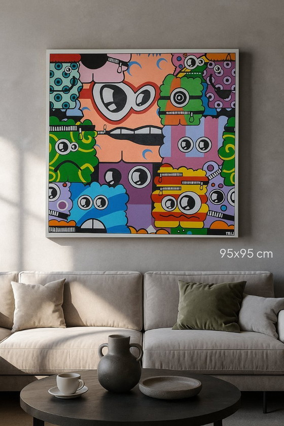 Este cuadro original, pintado a mano sobre tablero de fibra de densidad media, es una colorida colección de extravagantes criaturas de dibujos animados, cada una con su propia expresión. El estilo recuerda al arte pop urbano y a la cultura callejera moderna.