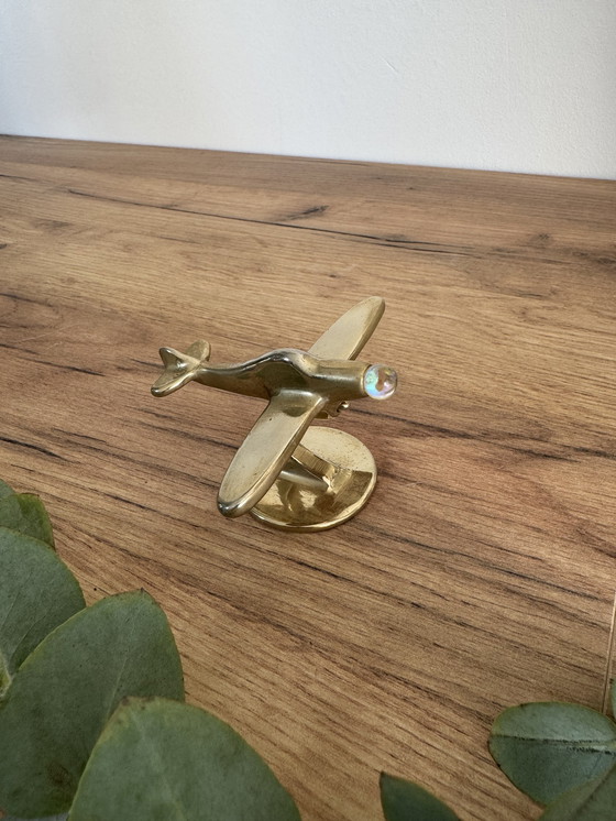 Encantador pisapapeles de latón con forma de avión, montado sobre una base con una pequeña bola iridiscente en la parte frontal que le da un brillo encantador con la luz.