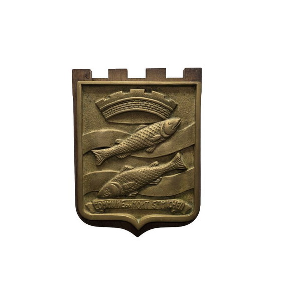 Antigua placa francesa de bronce, Comuna del Mont Saint-Michel, que data de alrededor de 1900. Esta placa de bronce macizo presenta el escudo de armas de la famosa ciudad francesa del Mont Saint-Michel. Tiene forma de escudo y está montada sobre una gruesa placa de roble moldeada, rematada con almenas.