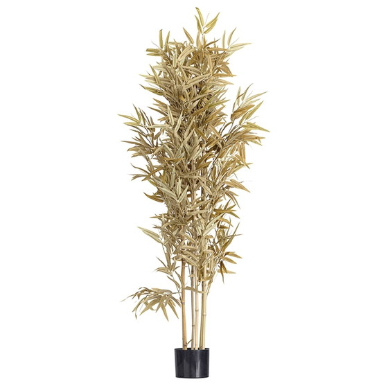 La planta de bambú artificial WOOOD mide 150 cm de altura y se presenta en una maceta de plástico. Sus tallos y hojas de formas realistas en tonos naturales aportan un toque encantador a cualquier interior. No requiere mantenimiento y está lista para usar, ideal para salas de estar, oficinas o entradas.