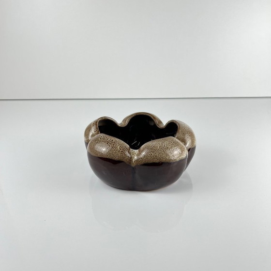 Esta baratija de cerámica esmaltada presenta una forma orgánica que recuerda a una flor o corola. Su acabado brillante combina un marrón intenso con un moteado beige en relieve, muy característico de las producciones artesanales de los años 60 y 70, en el espíritu del gres esmaltado de Vallauris o escandinavo.