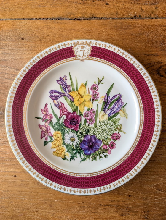 Precioso plato conmemorativo del 75.º cumpleaños de Su Alteza Real la Princesa Juliana, con motivo del 30 de abril de 1984. Diseñado por la artista de renombre internacional Elizabeth Riemer-Gerhardt, fue fabricado por Royal Mosa en porcelana fina con un borde de oro puro de 24 quilates.