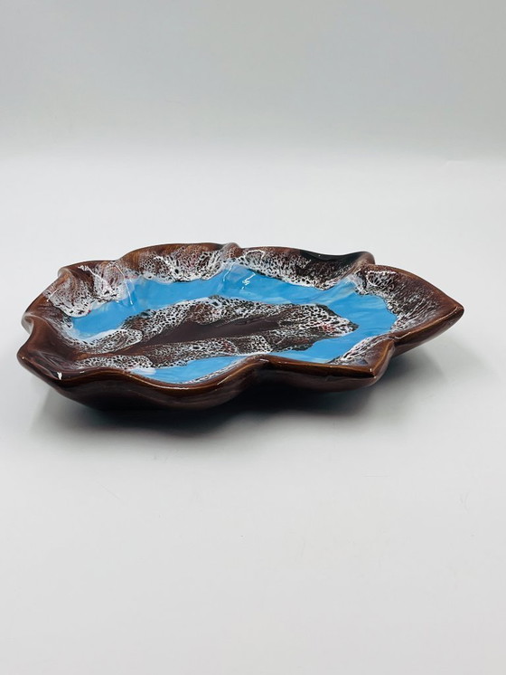 Descubra el encanto atemporal de este plato con forma de hoja de Vallauris, una pieza icónica de la cerámica francesa. Este plato se distingue por sus vibrantes tonos azules y marrones terrosos, que evocan la belleza natural de los paisajes mediterráneos.