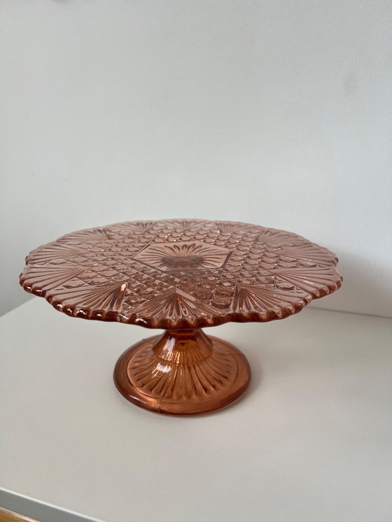 Preciosa base para tartas Art Déco rosa de Luxval Val St Lambert, fabricada en la década de 1930. Esta base vintage con pie, de vidrio prensado rosa, presenta un hermoso diseño geométrico Art Déco.