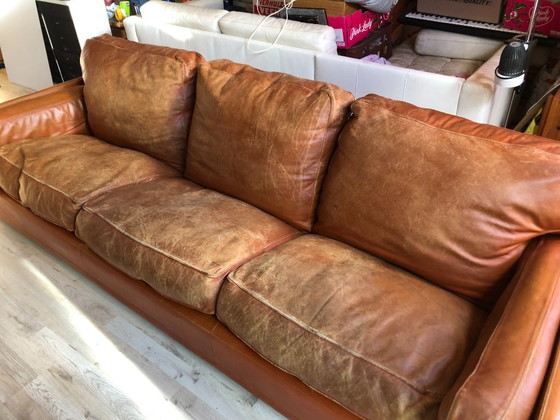 Hermoso diseño robusto con cojines de cuero sueltos y completos rellenos de plumón de pato (se añadió plumón nuevo hace unos diez años). El cuero es muy flexible. El sofá está en buen estado. El desgaste (vetas y decoloración en los cojines del asiento) es propio del uso y la antigüedad. La parte inferior presenta algunas manchas, al igual que el asiento bajo los cojines, por lo que no son visibles.