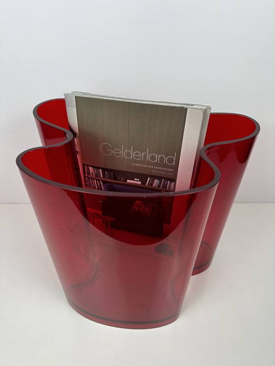 Revistero de forma orgánica fabricado en plástico resistente. Diseño: Guzzini. En perfecto estado, con pocas señales de uso. En un llamativo color rojo. Marcado. Alto: 30,5 cm. Ancho: 34 cm. Fondo: 21 cm. Peso: 2,3 kg.
