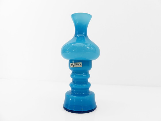 Excepcional portavelas de vidrio opalino soplado, de color azul turquesa, fabricado por el fabricante noruego Magnor Glassverk en la década de 1960. Su forma escultural, con un vientre abultado y un cuello ensanchado, evoca la estética orgánica típica del diseño escandinavo de la época. Detalles técnicos: • Fabricante: Magnor Glassverk A/S (Noruega) • Periodo: circa 1960 • Material: vidrio opalino soplado • Color: azul turquesa • Acabado: satinado, translúcido • Característica especial: con caja original ilustrada y etiqueta de la época. Dimensiones: • Altura: 24 cm (9,4 pulgadas) • Diámetro (máx.): 10 cm (3,9 pulgadas) • Peso: 1 kg. Estado: Muy buen estado general, con su caja original ilustrada. Etiqueta original conservada. Algunas microhuellas de uso, propias de su antigüedad, solo se aprecian en la caja. Ref.: NETS2760425