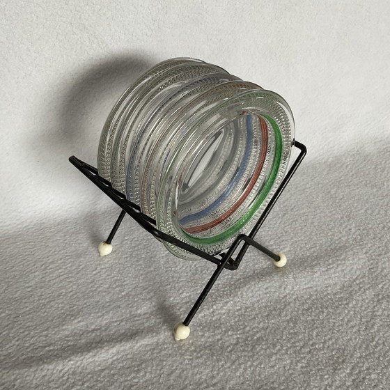 Posavasos, 5 piezas en un estante, años 60. Un posavasos con un desconchón (ver fotos). Multicolor.