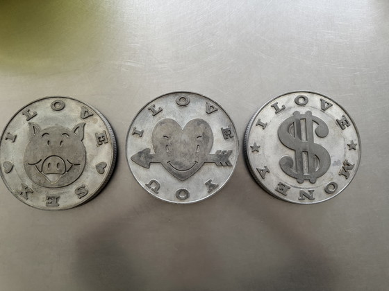 Tres posavasos de aluminio Alessi. Tamaño 18 cm. Texto: "Me encantan las monedas", "Me encanta el dinero" y "Me encanta el sexo". Están usados, pero en buen estado.
