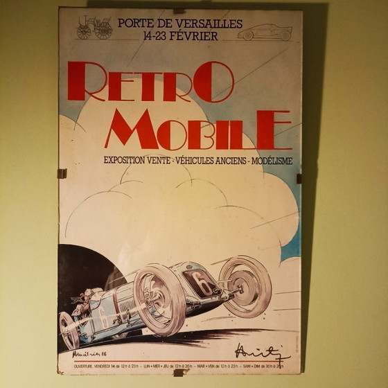 Póster retromóvil original firmado a mano de 1986 - François Bruère - enmarcado detrás de un cristal.