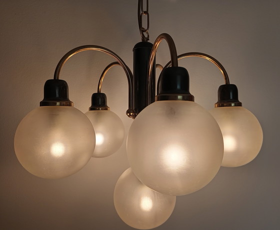 Atractiva lámpara de araña austriaca de los años 90 en muy buen estado con bolas de opalina blanca mate. Presenta algunas pequeñas astillas en los bordes de las bolas, pero no son visibles una vez instalada. Altura máxima de suspensión: 100 cm.