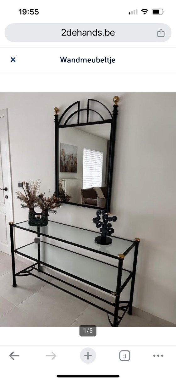 Este elegante mueble de pared con espejo grande es perfecto para cualquier interior moderno. Cuenta con una robusta estructura de metal y una cubierta de cristal con detalles dorados. Ideal para un recibidor o sala de estar, crea una sensación de amplitud y luminosidad.