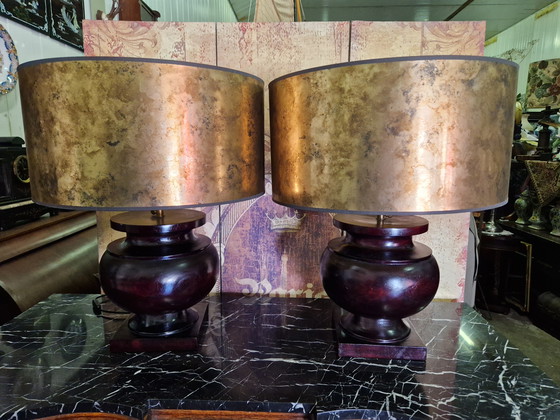 Este hermoso conjunto de lámparas de color latón desprende elegancia y sofisticación, perfecto para un interior que desprenda lujo y estilo. Las pantallas tienen un cálido brillo dorado que crea un ambiente acogedor en cualquier habitación. La robusta base de madera oscura añade un toque de encanto clásico, haciendo que estas lámparas sean a la vez funcionales y decorativas.