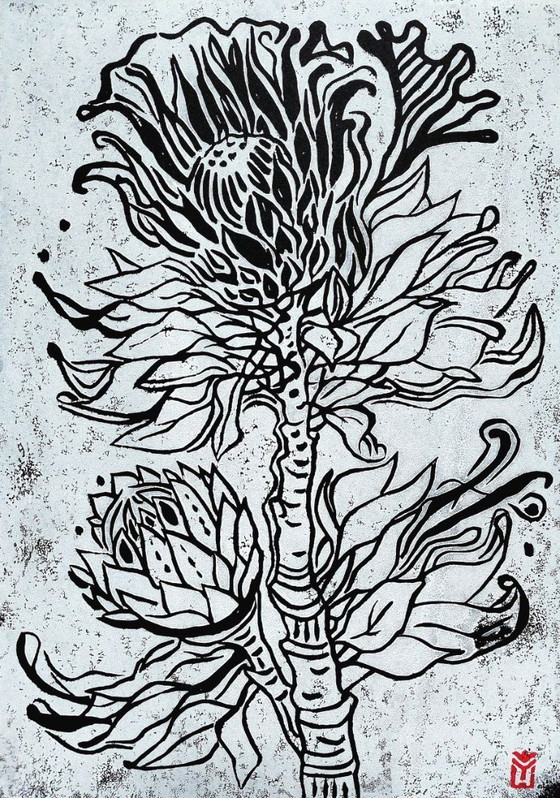 "Protea" es un linograbado impreso a mano de nuestra serie Botánica en blanco y negro, una exploración del contraste, la textura y la fuerza silenciosa de la flora silvestre.
