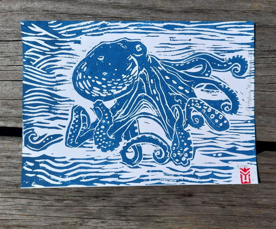Este linograbado presenta un pulpo estilizado nadando entre suaves olas oceánicas, impreso a mano en un suave color azul turquesa sobre papel blanco. La impresión forma parte de nuestra colección temática marina y aporta un toque de calma costera a cualquier espacio. Cada impresión se prensa manualmente, lo que hace que cada pieza sea ligeramente única.