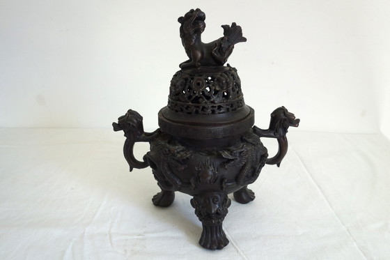 Quemador de perfume/incienso trípode grande con decoración de dragón, China