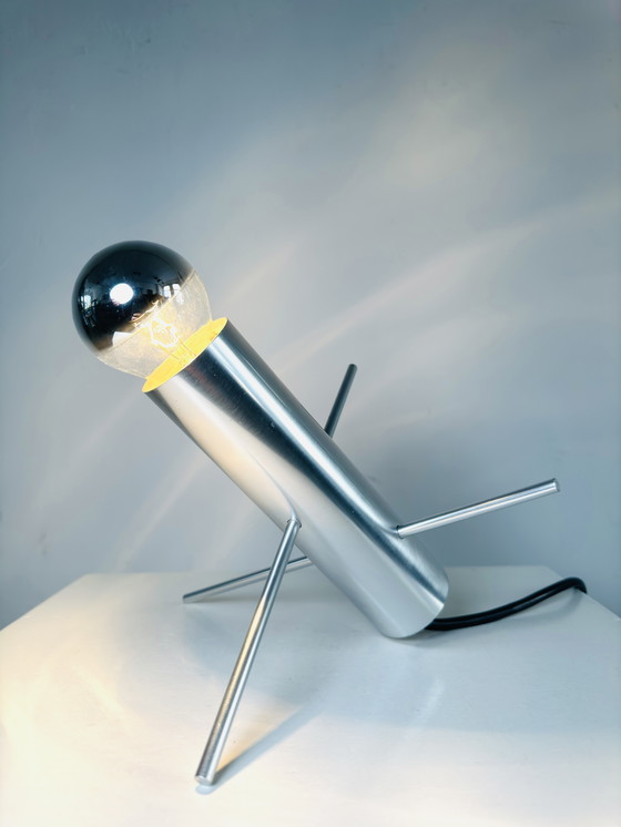 La lámpara mide 30 cm de largo y 5 cm de diámetro, y puede inclinarse o reposicionarse fácilmente ajustando las patillas de soporte. El interruptor de encendido y apagado está ingeniosamente colocado en la parte inferior de la lámpara, lo que acentúa su aspecto aerodinámico. Este ejemplar original de los años sesenta conserva la pegatina auténtica de Raak y se encuentra en muy buen estado vintage.