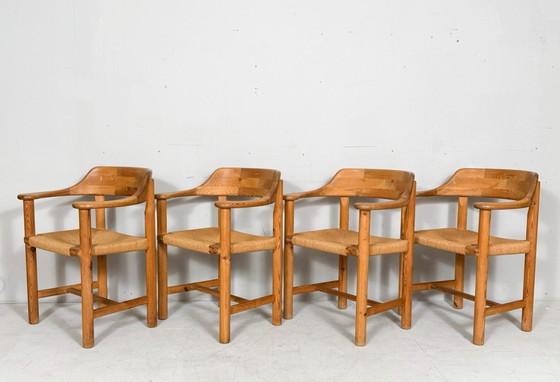 Rainer Daumiller & Poultries Pedersen für Grammrode, sechs Stühle / Esszimmerstühle, Kiefer, Papierkordel, 1970er Jahre, Dänemark. Set bestehend aus 4 Stühlen aus massivem Kiefernholz mit gebogenen Arm- und Rückenlehnen und mit Papierkordel bespannten Sitzflächen, H.76,5cm, Sitzhöhe: 44,5cm, B.64cm, T.40cm. (4)