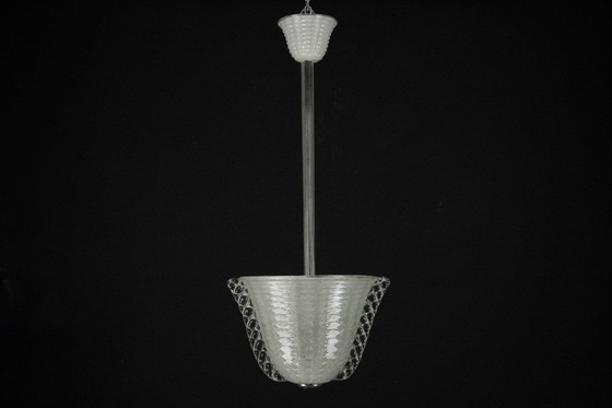 Impresionante y rara lámpara Art Déco diseñada por Ercole Barovier, fabricada en Italia en la década de 1940. Esta pieza excepcional está realizada en cristal Pulegoso de Murano, una técnica distintiva caracterizada por su textura ricamente burbujeada, que confiere al cristal un brillo suave y difuso único cuando se ilumina. La araña encarna la refinada elegancia del periodo Art Déco, con líneas audaces pero armoniosas y una artesanía impecable. Una auténtica pieza de coleccionista y un notable ejemplo de la maestría artística de Barovier y de la reconocida tradición vidriera de Murano.