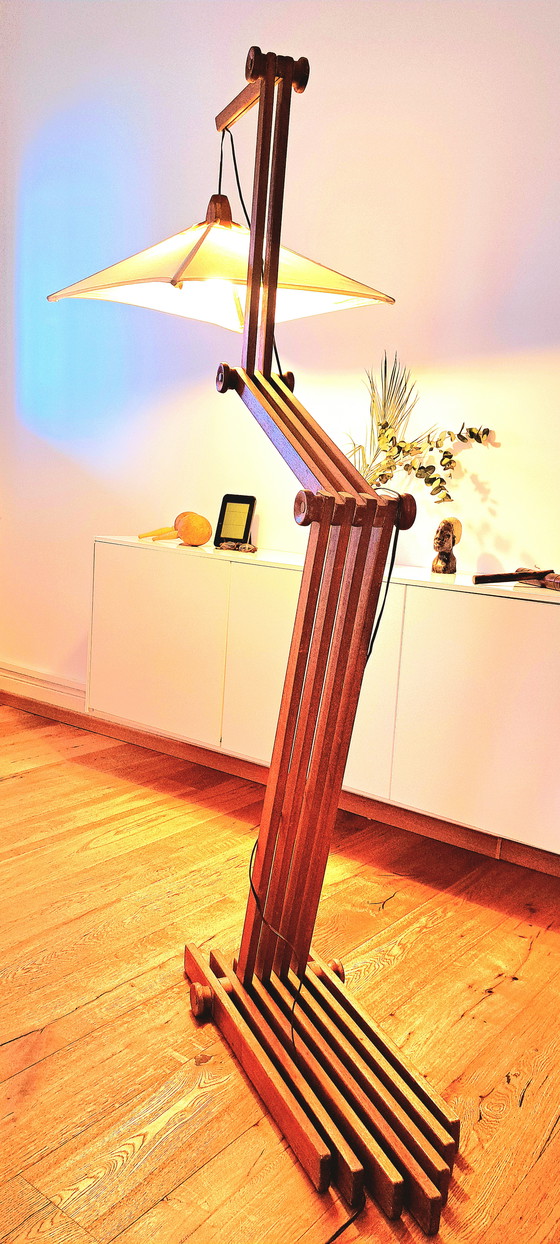 Una lámpara de pie de estudio grande y ajustable con una pantalla de algodón. Originalmente comprada en México en la década de 1970. Según el propietario original: La lámpara tiene 45 años. Llegó a Alemania desde México después de que su padre terminó su trabajo en México. Esta hermosa lámpara de pie se puede ajustar utilizando cada una de las cuatro articulaciones, que se atornillan con tornillos para madera. La pantalla de tela se puede quitar, así como las varillas de la pantalla, y el marco de madera se puede desatornillar para que la lámpara sea fácil de transportar. Los tornillos se desatornillan en la dirección opuesta. Una solución muy inteligente y única. Detalles: - Alto: 195 cm - Ancho: 178 cm - Fondo: 89 cm - Material: Roble - Lugar de origen: Sudamérica, México - Periodo: 1970 - 1979 - Estado: Bueno - Recableado: Recableado. - Reemplazos realizados: Cableado. Desgaste consistente con la edad y el uso. Se reemplazó una varilla de la pantalla. Un trozo de madera roto en la parte superior.