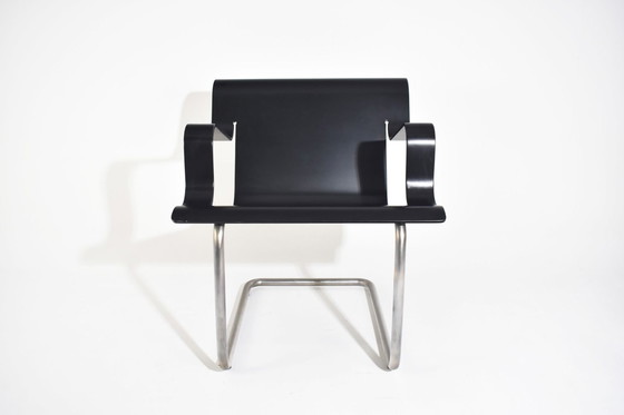 Este sillón es la escurridiza reedición de Atelier de la década de 1990 del experimento "híbrido" de Aalto de 1932. Se fabricó en una pequeña serie numerada internamente, que probablemente constó de menos de cincuenta piezas. Se caracteriza por el armazón de metal sin tratar en combinación con la placa adaptadora de madera contrachapada, un vínculo entre la serie de salón de los años 60 y la serie de prueba CNC cortada con láser de 2010. La laca negra excelentemente conservada y el acabado cromado satinado del armazón la convierten en una de las piezas mejor conservadas de esta serie.