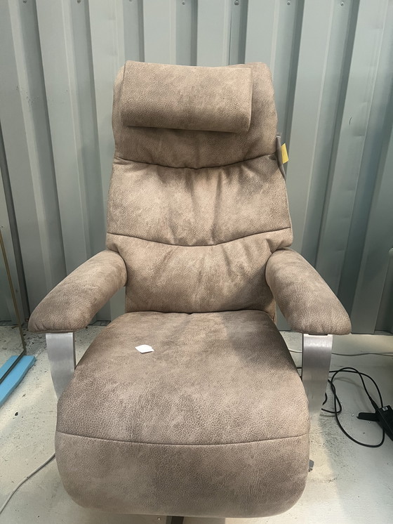 Este sillón eléctrico elevable está confeccionado en una cálida tela color topo/beige con un diseño moderno. Los reposabrazos de aluminio le dan un toque de lujo.