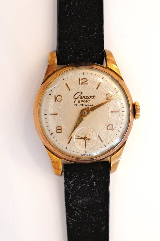 Descubre la elegancia atemporal de este reloj de mujer de los años 50, una auténtica joya vintage bañada en oro de 10 micras. Fabricado por la prestigiosa marca suiza Geneve, este modelo Sport de 17 rubíes encarna la fusión perfecta entre estilo y funcionalidad.