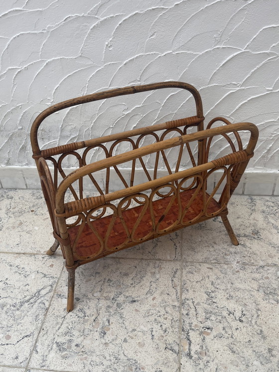 Precioso revistero de bambú con base de madera. Muy buen estado. Dimensiones: Alto 38 x Ancho 43 x Profundidad 26. Ref.: PC46AGQF