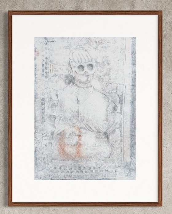 Este cuadro de Robert Detheux, titulado *Le secrétaire particulier* (1976), es una representación enigmática y sutil de una figura con un rostro estilizado, casi fantasmal. El dibujo, realizado con una paleta muy pálida y trazos delicados, da una impresión de fragilidad y vaguedad, como si la figura se desvaneciera o se disolviera en un fondo abstracto y texturado.