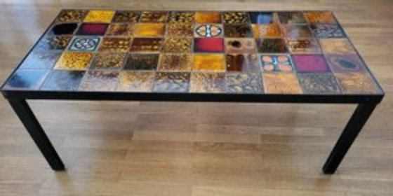 Esta mesa de centro, diseñada por Roche Bobois, es una auténtica joya del diseño, que combina estética y funcionalidad. Fabricada en cerámica vidriada de colores cálidos, destaca por su brillo, que se mantiene vibrante a pesar del uso. Compuesta por 50 piezas en muy buen estado, demuestra la excepcional artesanía de grandes ceramistas como Jean Gregorieff, quien colaboró con la famosa marca. La base de metal negro aporta un toque contemporáneo, sujetando la superficie con discreción. Aunque presenta ligeras señales de desgaste, propias de su antigüedad y uso, estas características no restan en absoluto al encanto y la elegancia de esta pieza única. Una mesa de centro que enriquecerá cualquier interior con su carácter cálido y artístico. Foto: Catálogo Roche Bobois 1969