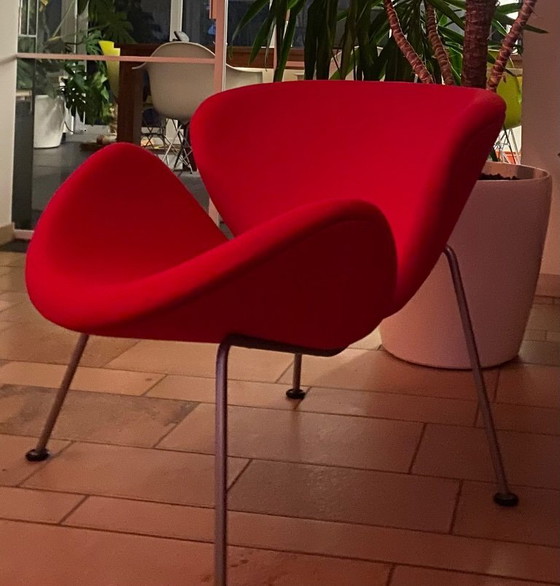 Esta elegante y moderna silla Artifort Orange Slice, diseñada por Pierre Paulin, presenta un vibrante tapizado textil rojo y elegantes patas metálicas que le confieren una estética contemporánea. Su forma única ofrece comodidad y un atractivo visual impactante, convirtiéndola en el complemento perfecto para cualquier espacio de estar u oficina moderna.