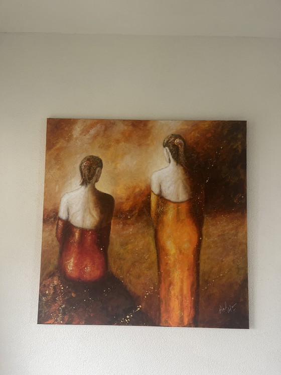 Este es un cautivador cuadro moderno de Roel Hofman, con dos figuras en un entorno cálido y abstracto. La obra se caracteriza por el rico uso de tonos naranjas, marrones y rojos, que crean una atmósfera vibrante y emotiva. La textura del lienzo añade profundidad e interés a la obra, convirtiéndola en un llamativo complemento para cualquier colección de arte. El cuadro está en perfecto estado y muestra el estilo y la atención al detalle característicos de Hofman.